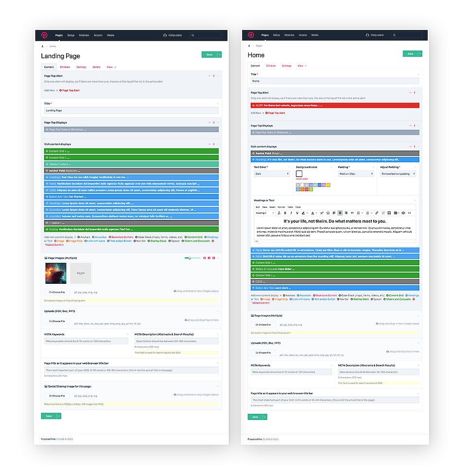 Landing pages offer a variety of stackable content displays or blocks. All these blocks are built the same way: add one from the list, fill in the details (colors, padding, width, buttons, etc.) and save. Blocks open and close by clicking on their trigger bars. You can drag any block by the bar to reposition them in the stack. You can duplicate them, turn them off to keep (but not display them;) – even copy them from one page and paste them to any other landing page in your website. You can also delete them.