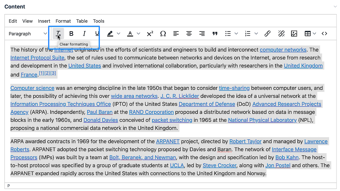 Next step is to select all the content and hit the remove formatting button in the navigation...