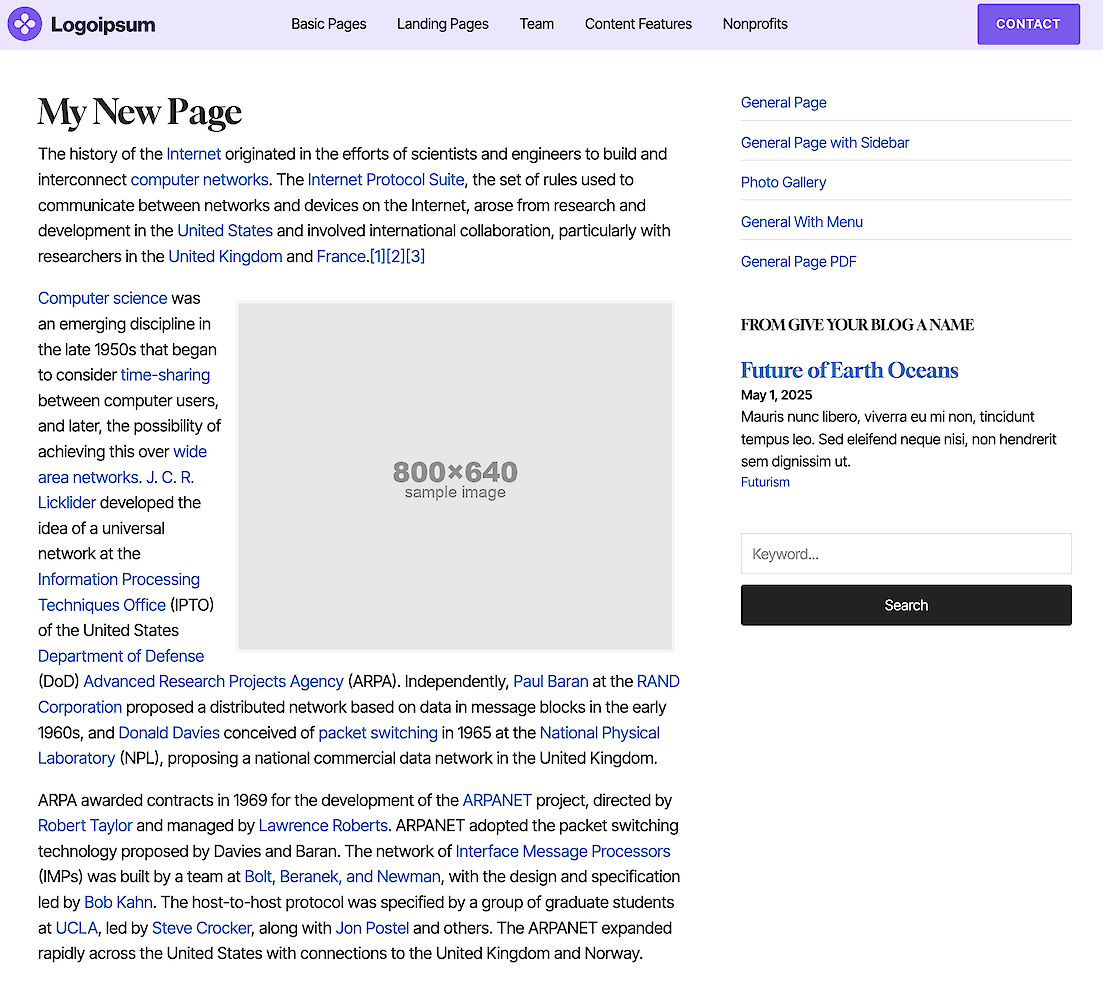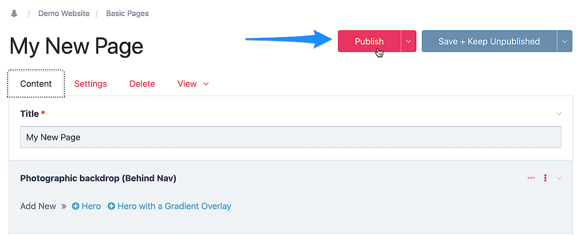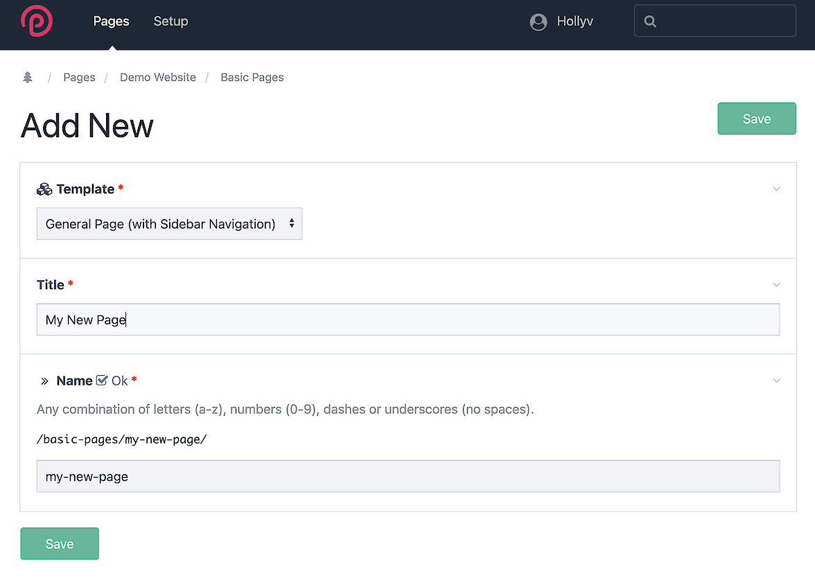 Once you create a new page, the first step is to give it a title and click save. The title can be changed at any time. You will also choose a template, for your page from the drop down menu, if one was not automatically chosen. Calendars, blogs, news and media items all have pre-defined templates.