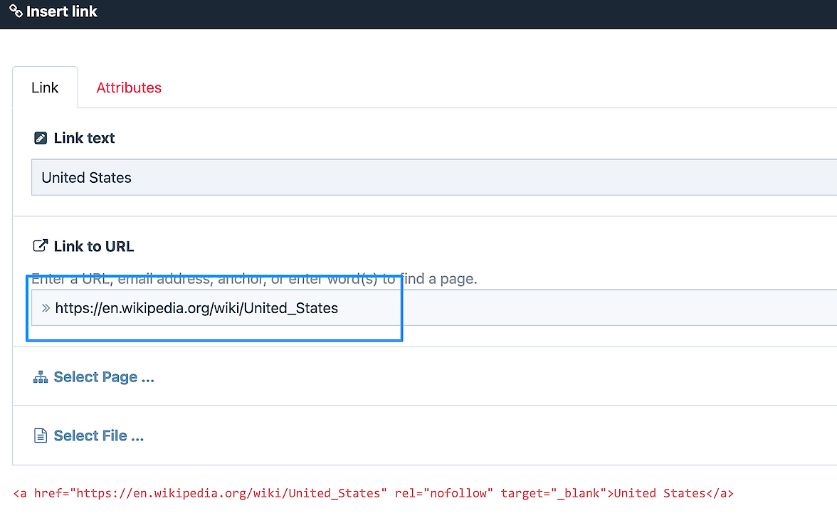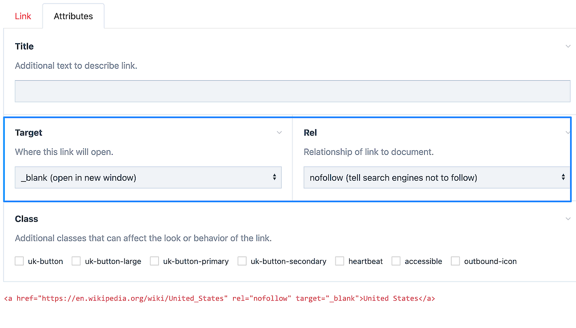 All outbound links will automatically launch a new browser tab. Checking the Attributes tab in the editor will reveal a variety of options including button makers.