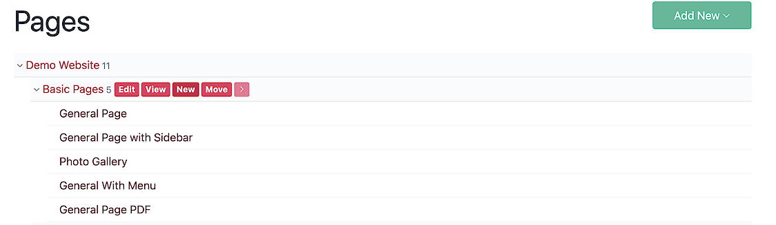 To create a new top level page, mouseover the home page in the document tree – and from the flyout menu choose "New." To create a subpage for another page, mouseover that page title, and choose from the flyout menu: New.