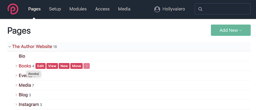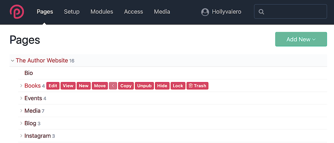 All the tools you need to create, publish, unpublish, hide, delete, copy or move pages appears in the red flyout menu when you mouseover any page title.