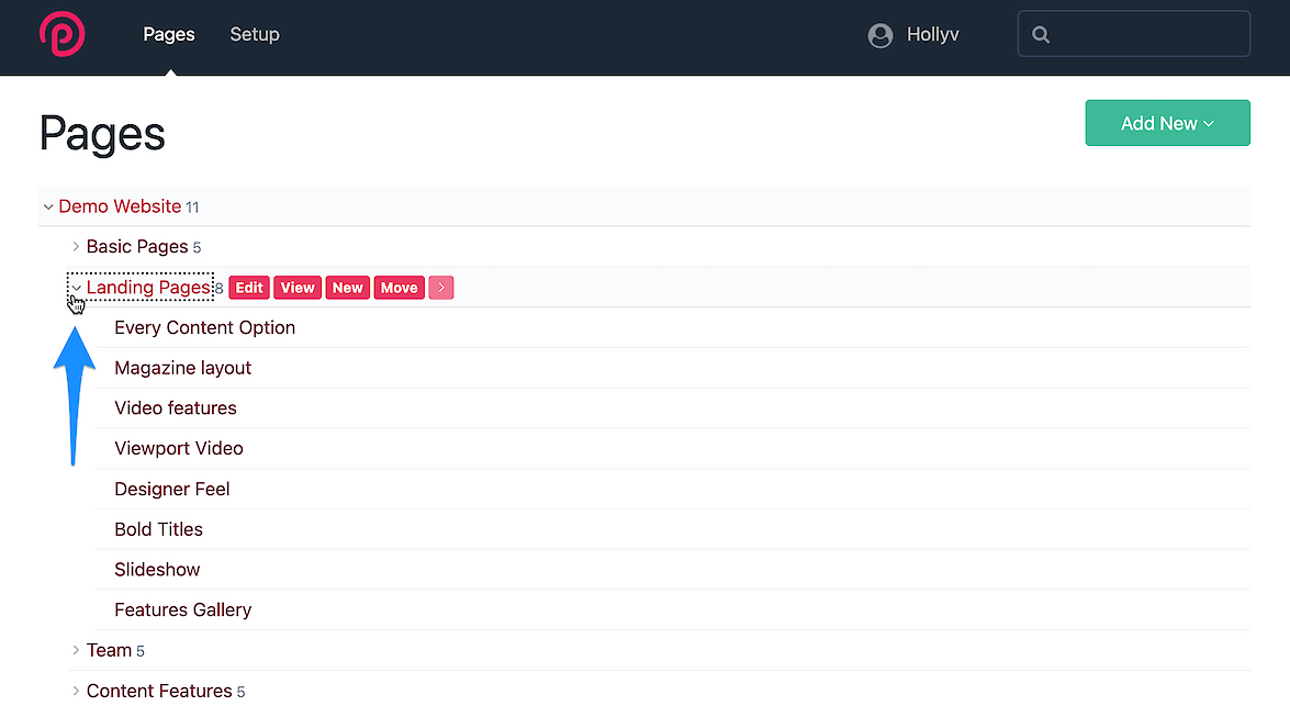 In the screen below, the Landing Pages section has 8 subpages, and you can reveal those pages by clicking the arrow in the document tree.