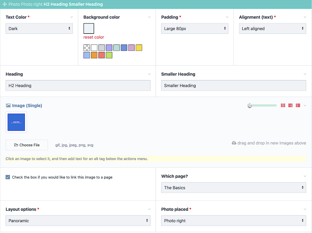 These are kind of the bread and butter of the web. They are easy to create in the content grid as well, but this version gives you the full panoramic options and makes it simple to stagger photos left and right down the page, while keeping the content centered vertically and horizontally.