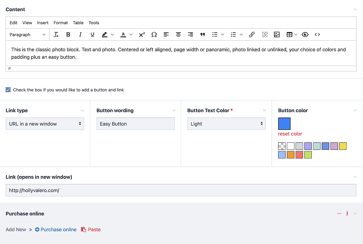 This is the classic photo block. Text and photo. Centered or left aligned, page width or panoramic, photo linked or unlinked, your choice of colors and padding plus an easy button.